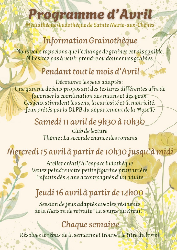 Page FACEBOOK : https://www.facebook.com/Médiathèque-de-Sainte-Marie-aux-Chênes-114948510239719/?epa=SEARCH_BOX