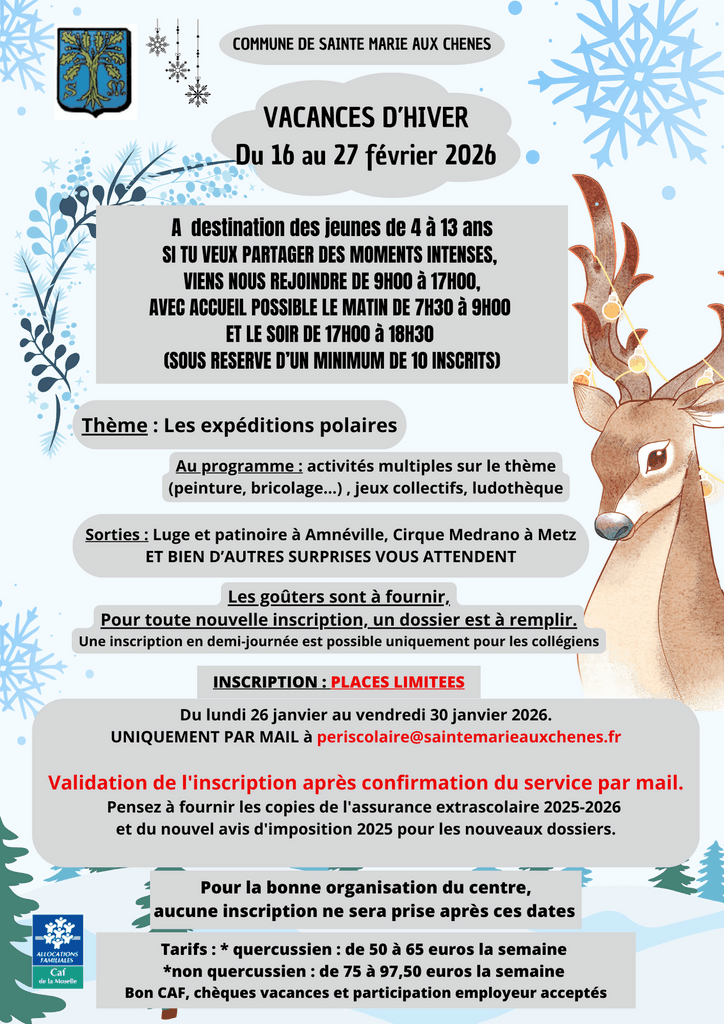 La commune organise un accueil de loisirs du lundi au vendredi pendant les vacances d'hiver (du 16 au 27 février 2026).
